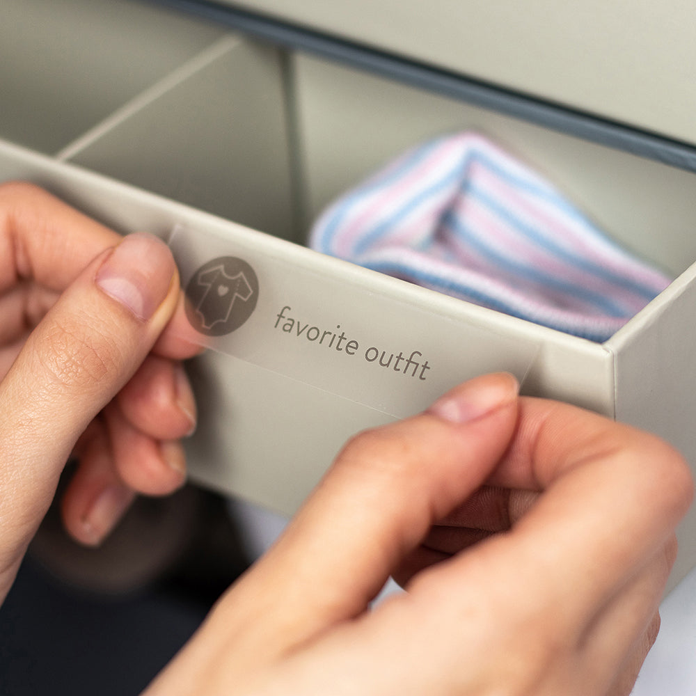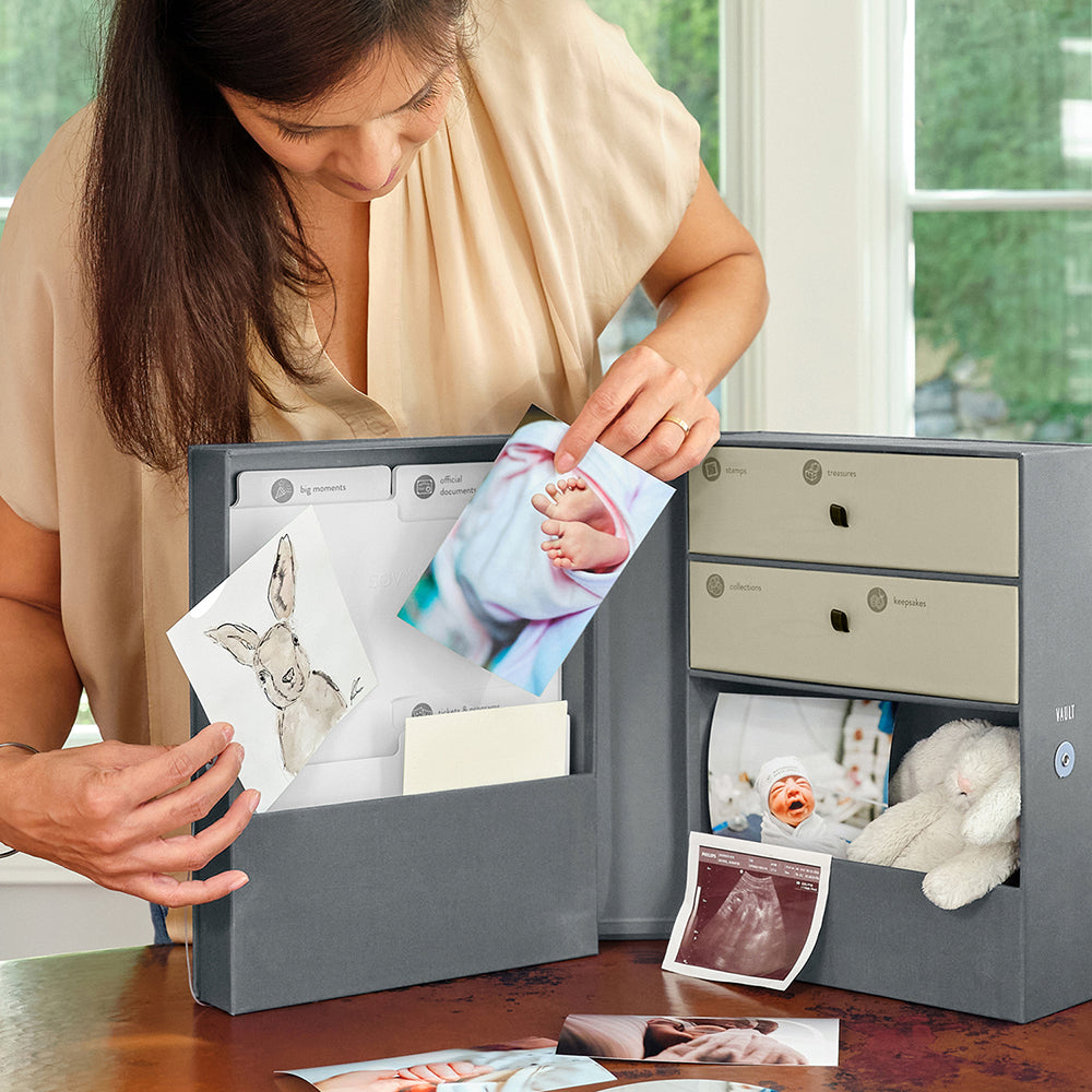 From her first lost tooth to his first sonogram, keep the most special childhood memories safe in Savor's Baby Vault Keepsake Box. Custom-dyed fabric lined with acid-free paper provides a safe all-in-one solution for the important documents and objects from baby's early years. Over 50 individually-illustrated labels show what to save and where to find it, from sonograms to blankies.