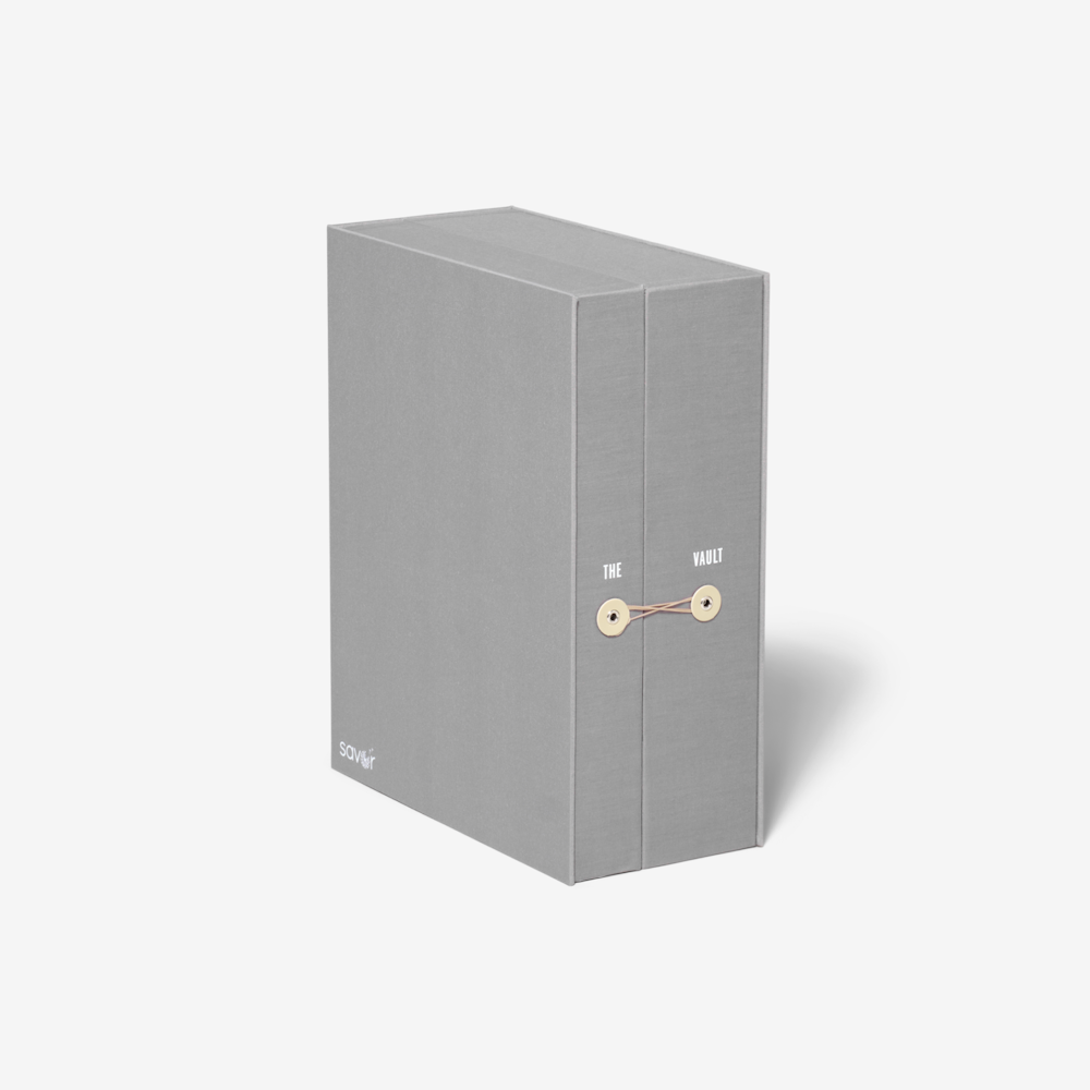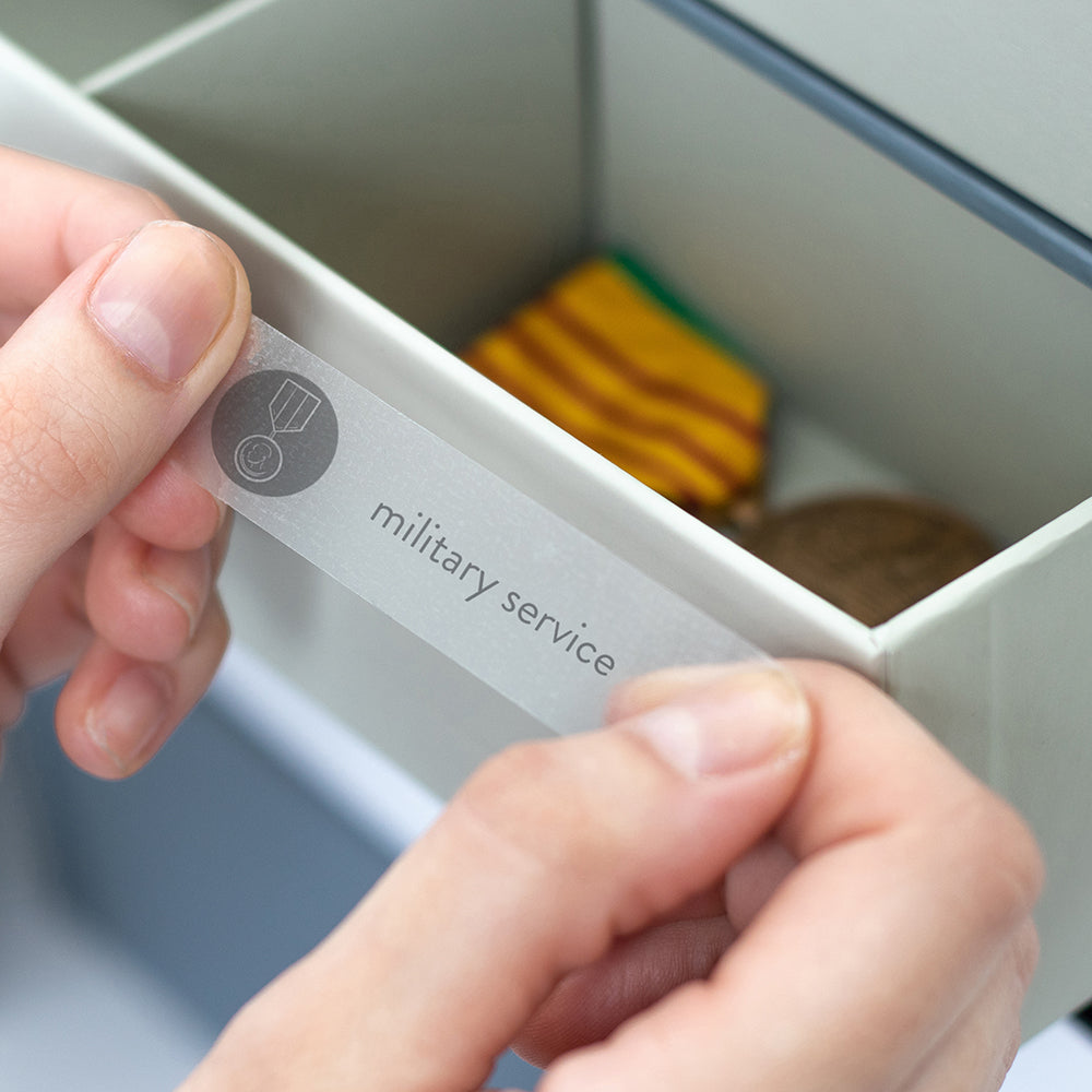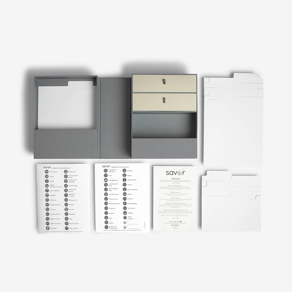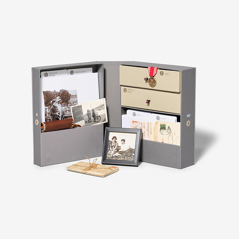 The Family Heritage Keepsake Box keeps treasured family heirlooms and photographs safe and organized. Maybe mom and dad are retiring. Or maybe you inherited a bunch of family heirlooms and you want a safe place to store them. Or you're downsizing. The Vault Family Heritage Keepsake Box keeps these important items, from military medals to family deeds and documents safe and fit for display. Hand-illustrated labels, files, drawers, and cubbies guide you in what to keep and where to find it.